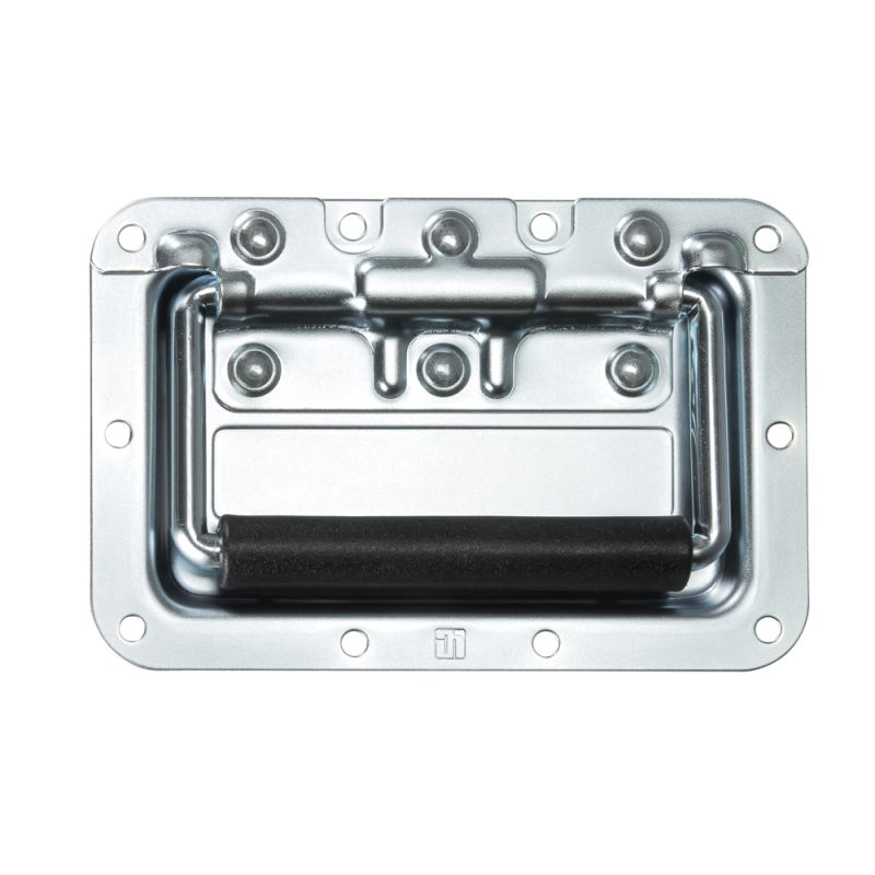 Poignée encastrée à ressort, de taille moyenne, dans une encoche de 8 mm de profondeur. Poignée encastrée à ressort avec poignée de largeur totale et plaque supérieure renforcée dans une encoche en acier de 8 mm de profondeur. Plaqué au zinc avec poignée en PVC noire.