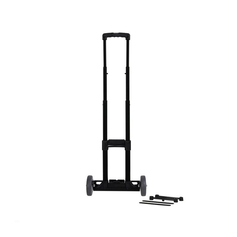 Poignée extensible à trois étages avec bouton de verrouillage sur la poignée. Les tubes sont en aluminium noir, la poignée et les plaques de montage en plastique. Les roues montées sur roulements à billes sont fixées à un cadre robuste en acier revêtu de poudre noire. Le chariot est très facile à manœuvrer grâce à la poignée, grâce aux grandes roues et à la large empreinte des roues. La poignée s'enclenche dans deux supports en plastique inclus sur le caisse.